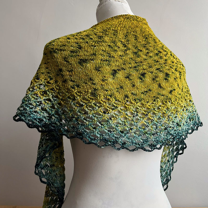 Sea Swash (Susan Ashcroft) This delightful one-skein shawl knit with Malabrigo Metamorphosis Sock Cakes is a lovely way to show off any gradient yarns. The lace is decorative enough to give a classic look using solid or speckled skeins as well. Sea Swash has an easy-to-execute lace edging for a beautiful finished product. We recommend working on this at a slightly looser gauge than you would for socks to give this shawl a stunning drape. Malabrigo's Metamorphosis Sock Cakes are a slow-changing gradient yarn that move from light to dark all in one cake. Plied with 100% superwash merino wool, each super-soft cake contains 440 yards of fingering weight yarn. Materials List